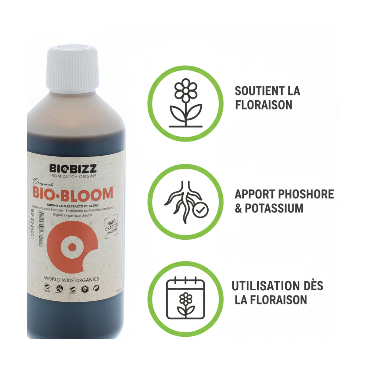 Bio·Bloom™ peut être utilisé de la période de floraison jusqu'à la récolte. Biobizz conseille d'ajouter environ 2 à 4ml de Bio·Bloom™ par litre d'eau.