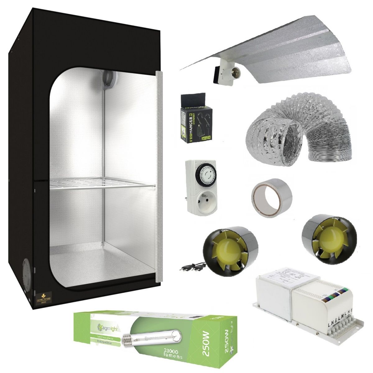 Pack Secret Jardin avec tente Dark Street 90x90x178cm nouvelle version R4 équipé d'un éclairage HPS 250W double spectre croissance et floraison Agrolight, d'un réflecteur ouvert, d'un ballast Florastar compact et programmateur d'éclairage. Ce pack DS 90 dispose d'un système d'apport et d'extraction de l'air 2 x 190m3/h avec gaine de ventilation alu 125mm Rodwin ventilation.