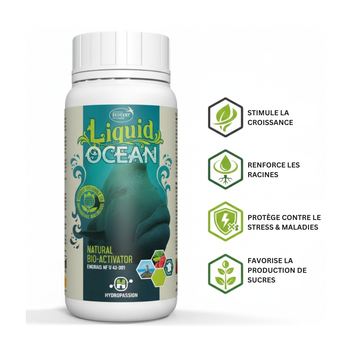 Liquid Océan est un bio-stimulateur et bio-activateur de croissance. Il servira à équilibrer le métabolisme des végétaux soumis au stress ou aux effets phytotoxiques.