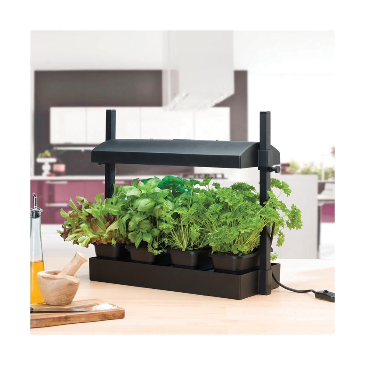 Le mini potager urbain Garland avec rampe LED 8W permet de cultiver facilement vos plantes en intérieur, toute l’année. Grâce à son éclairage à spectre complet, il reproduit la lumière naturelle du soleil et favorise une croissance continue, même en absence de lumière naturelle suffisante.