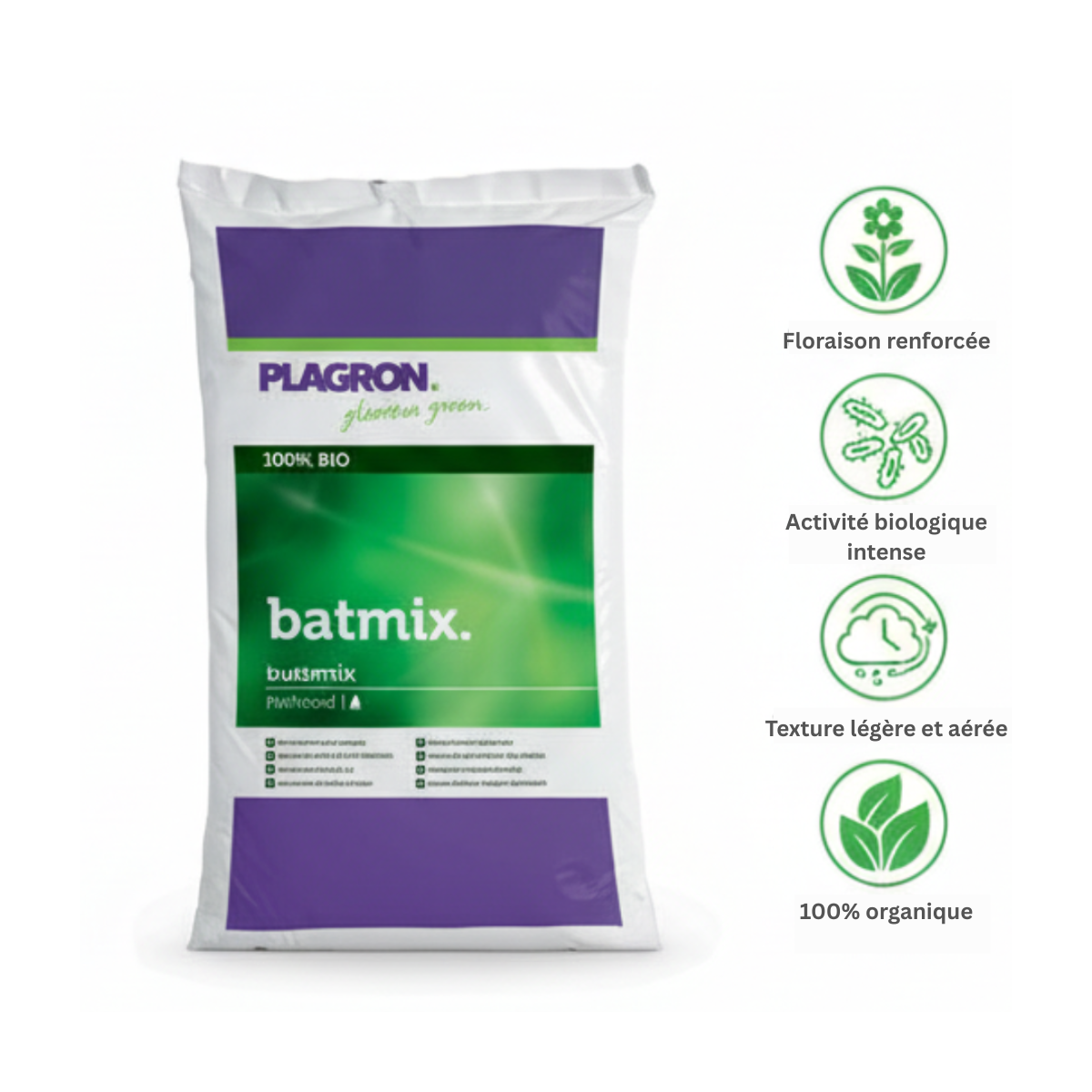 Avec un pH compris entre 6.5 et 7.5 et une conductivité électrique (EC) de 2.0-2.5 mS/cm, Batmix offre un équilibre idéal pour favoriser une croissance et une floraison optimale. Son utilisation ne nécessite aucun apport d’engrais supplémentaire pendant les premières semaines, rendant ce substrat à la fois pratique et économique.
