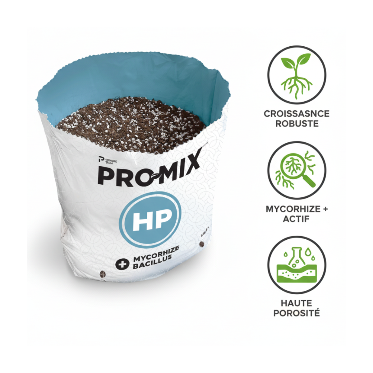 En choisissant le sac de culture prêt à l'emploi PRO-MIX HP, vous contribuez à maintenir un environnement de culture plus propre, à prévenir la contamination et à réduire les risques de maladies racinaires. De plus, la désinfection et la stérilisation des espaces de culture sont simplifiées grâce à un système plus rapide et plus propre, nécessitant une manipulation minimale.